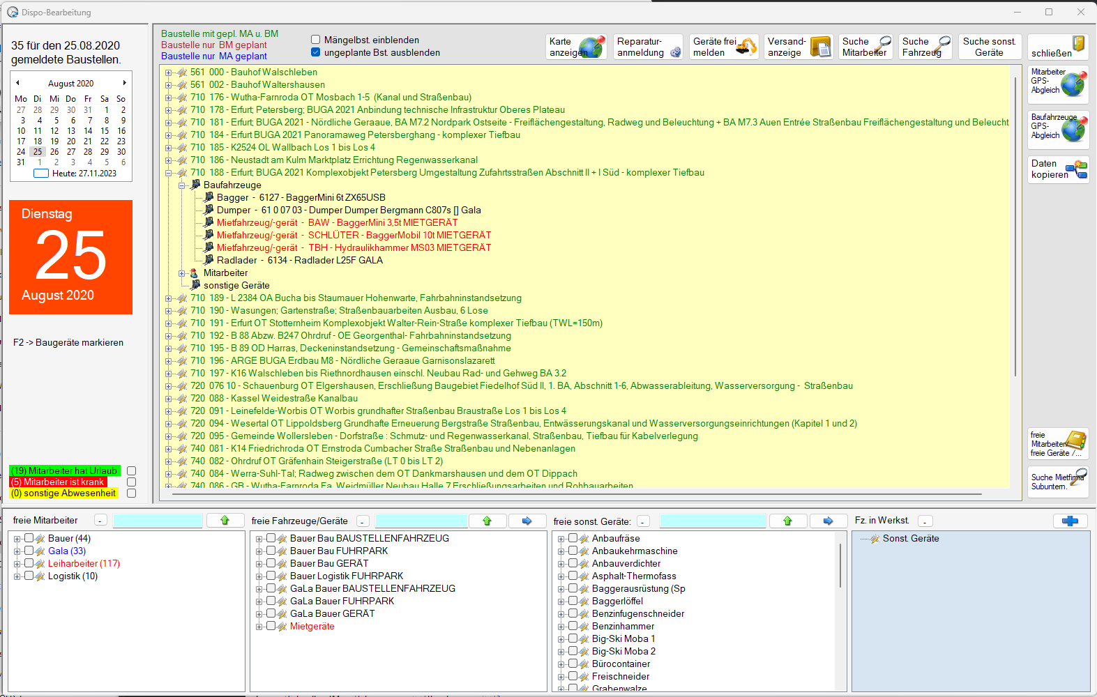 Verwaltung von Baustellen mit Fahrzeugen und Mitarbeiter, inkl. GPS-Anbindung  (Kienzle / S-Tec), Kartendarstellung (Google/OpenStreetView), Personen/ Fehlzeiten aus BRZ-System usw.